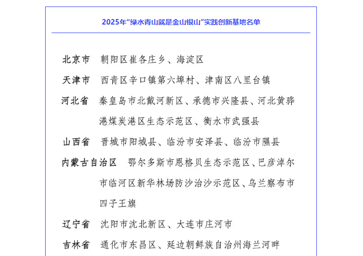为深入贯彻习近平生态文明思想,积极探索“绿水青山就是金山银山”有效转化路径,经审核,生态环境部决定命名重庆市南川区金佛山片区、梁平区等91个地区为2025年“绿水青山就是金山银山”实践创新基地,现予公告。